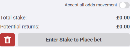 You won’t see “Accept all odds changes” in the same place across different bookmakers, as some bookmakers won’t display this option at all, while others will display it in the bet slip. For example, Paddy Power shows this in their betting slip: