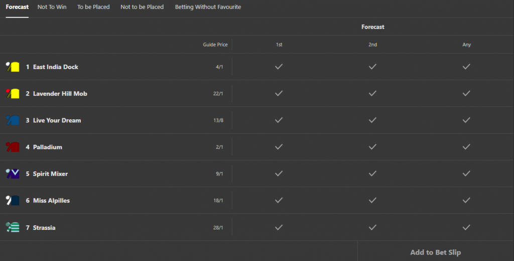 Finally, for the combined forecast, you need to repeat the same process as for the backward forecast, but this time you can choose three horses. Due to the betting combinations covered by this market, the stake needs to be multiplied by six.